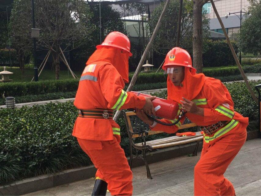 第一天首先進行的是商管組。商管組比賽內(nèi)容是4*100米接力滅火操作及二人二盤水袋連接出水操作。4*100米接力滅火比賽規(guī)則為第一名參賽隊員聽到預備口令時,在起點線做好起跑準備,另外3名隊員分別在100米處和起點線做好交接準備,輔助人員將油盆的火點燃。聽到起跑信號,第一名隊員立即拿起滅火器向前跑(第一次搶跑重跑,第二次再搶跑的不記取成績),到100米處將滅火器交給第二名隊員,其他隊員以此類推。第四名隊員攜帶滅火器跑至油盆區(qū),利用滅火器將油盆的火撲滅后沖出終點線。二人二盤水袋比賽規(guī)則為連接出水操作聽到“開始”的口令或信號,第一名隊員先甩開第一盤水帶,將一端接口交給第二名隊員,第二名隊員將水帶連接在分水器上,做好出水準備;第一名隊員攜帶水帶另一端和另一盤水帶向射水線跑動,在跑動過程中將第一盤的水帶接口與第二盤水帶進行連接并鋪設(shè)好第二盤水帶,動作完成后連接好水槍在射水線做好打靶準備,然后示意第一名隊員出水,待水槍出水后將靶打到。