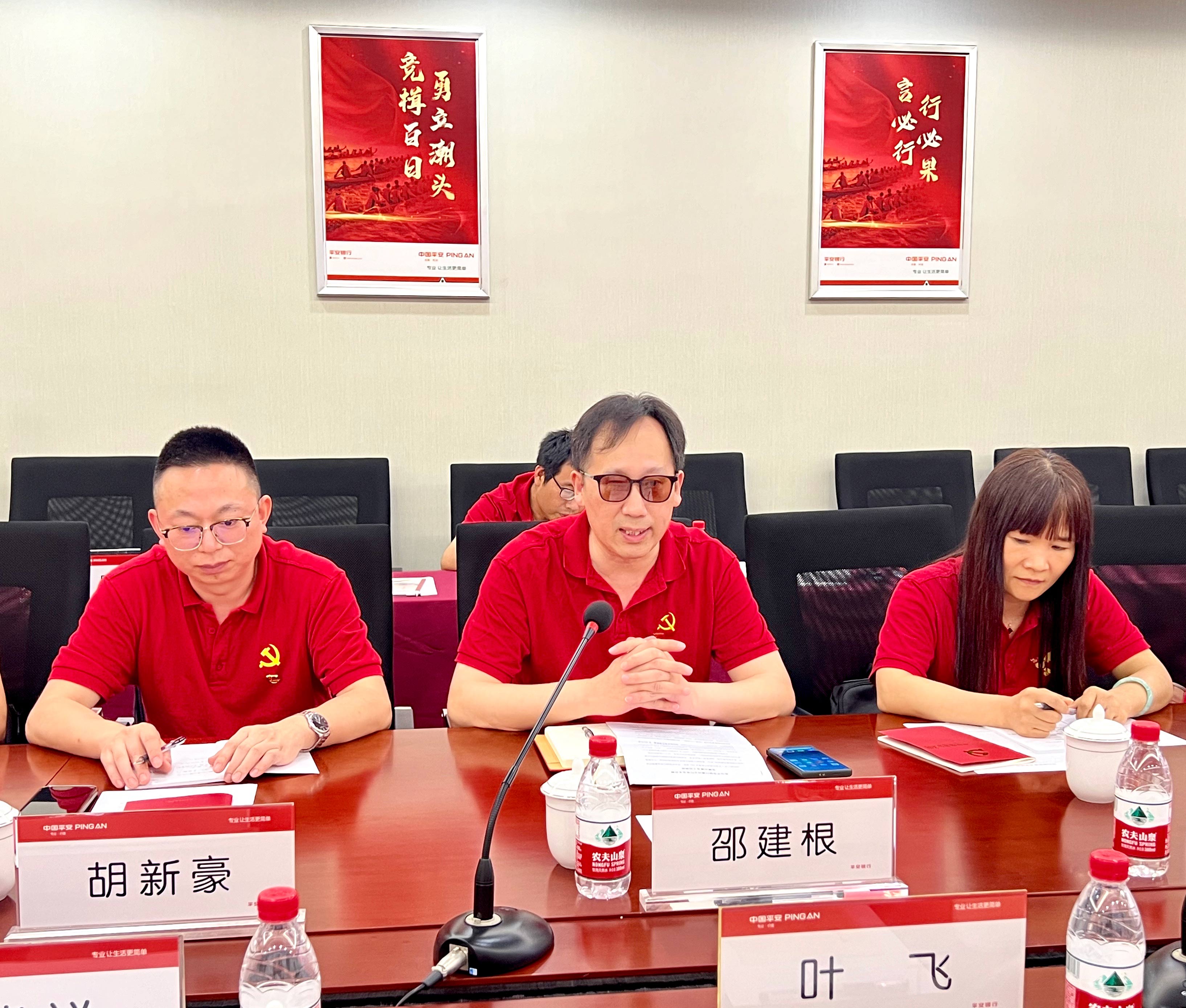 參觀結(jié)束后,所有黨員一同前往平安銀行紹興分行本部參加銀企座談會(huì)。在開場(chǎng)中,葉飛行長(zhǎng)代表平安銀行紹興分行熱烈歡迎金廈集團(tuán)的黨員干部們來到紹興、走進(jìn)紹興分行,并對(duì)平安銀行的歷史沿革和業(yè)務(wù)脈絡(luò)進(jìn)行了簡(jiǎn)要介紹。葉行長(zhǎng)表示,金廈集團(tuán)是紹興分行合作時(shí)間最久的一家優(yōu)質(zhì)民企,雙方在長(zhǎng)達(dá)15年的合作中始終不離不棄,打下了深厚的互信合作基礎(chǔ),樹立了良好的銀企合作典范。他希望雙方未來以此次黨建共建為基礎(chǔ),進(jìn)一步加強(qiáng)交流、深化合作,共同開創(chuàng)雙贏未來。