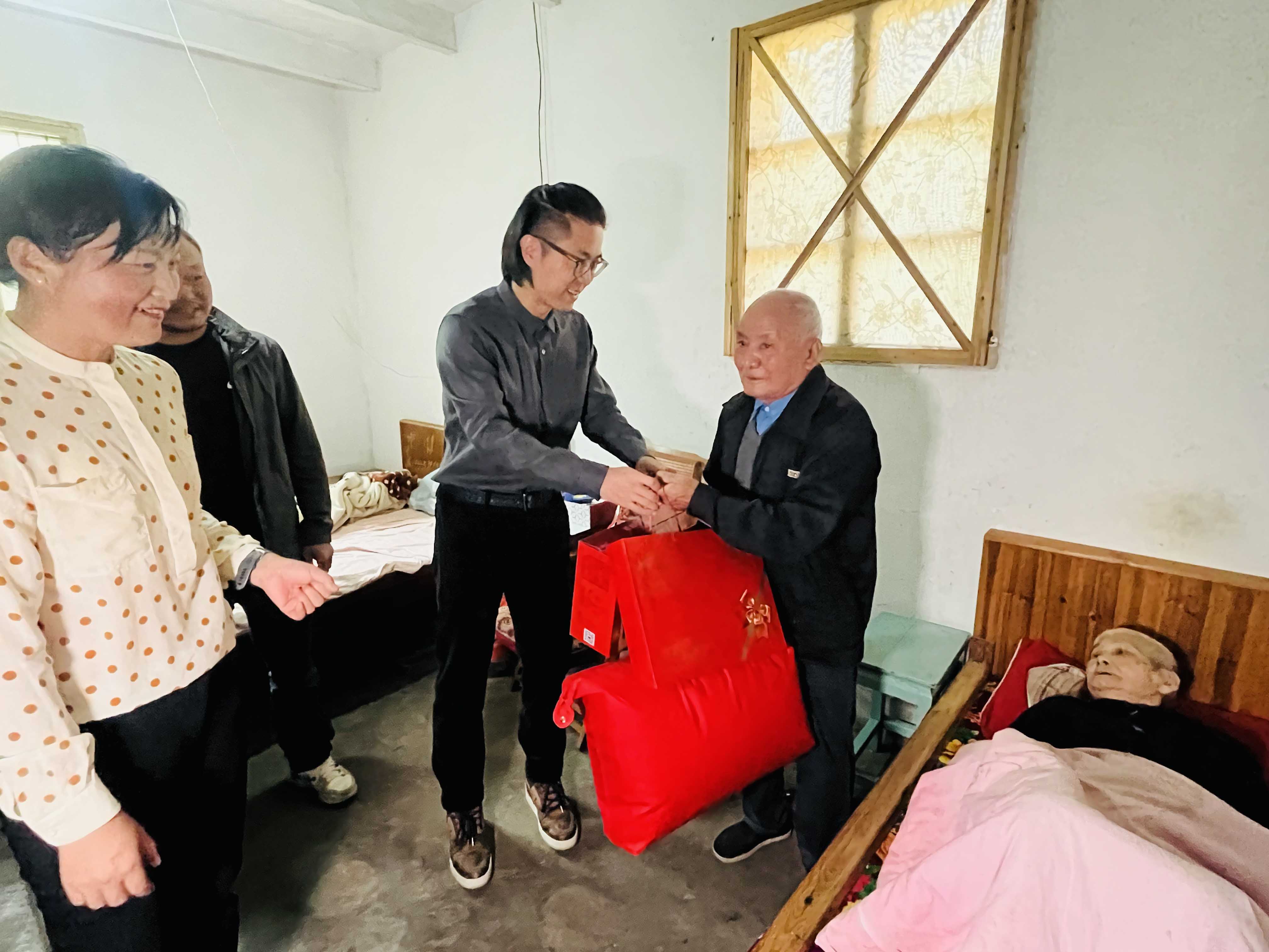 “重陽節(jié)快樂,祝你們健康長壽!”在村領(lǐng)導(dǎo)的陪同下,蔣晨虹董事長、傅融總裁一行走訪了村里的困難家庭,為他們送上慰問金及食物、被子、洗浴用品等生活物資,并與他們親切交談,關(guān)心詢問他們的身體狀況和生活情況。這不僅讓困難家庭感受到了社會的溫暖和關(guān)懷,也進一步體現(xiàn)了金廈對弱勢群體的關(guān)注和支持。
